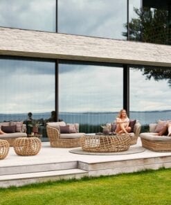 Basket har et design der kendetegner de klassiske kurvemøbler, men med Cane-lines solide materialer, kan du trygt rykke dem ud i haven.
