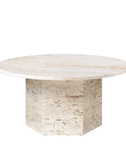 Fremstillet i Italien af travertinsten, understreger den monolitiske form stenens materialitet, dens naturlige skønhed i dens årer og den livlige tekstur af dens unikke patina – hvor en ny detalje kan opdages ved hver brug.