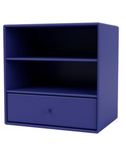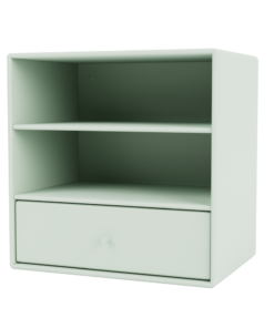 Montana Mini med hylder og to skuffebakker. Skuffebakkerne kan trækkes helt ud af modulet og passer ind i alle tre rum. Modulet kan ydermere anvendes med eller uden skuffebakkerne.