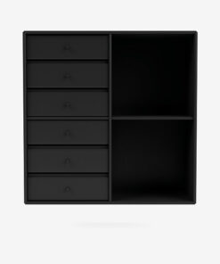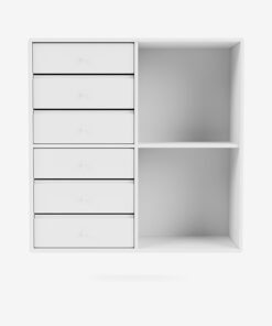 1623 reolen har seks skuffer og to store åbne rum. Modulet tilbyder dig en praktisk og betagende kombination af aflukket opbevaringsplads og åbne rum. De åbne rum er skabt til at udstille dine yndlingsbøger, din flotteste vase eller en smuk skål.