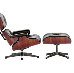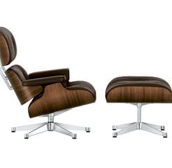 Eames Lounge Chair er designet af Charles & Ray Eames i 1956. Fremstilles i to størrelser og med fodskammel, i forkromet aluminium, poleret aluminium eller poleret aluminium med sorte kante, og med skaller i krydsfinér i enten kirsebær, palisander eller mørk valnød. Der findes desuden en lys kombination med stel i poleret aluminium og skaller i hvidpigmenteret valnød og med hvid læder og en mørk kombination med stel i sortlakeret aluminium og skaller i sortlakeret ask og med sort læder. Eames Lounge Chair leveres med polstring i en eksklusiv semi-anilin læder, Premium læder, Grand læder, i farverne sort, chokolade, brun eller hvid.