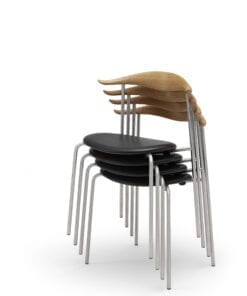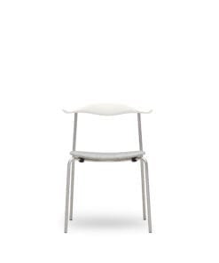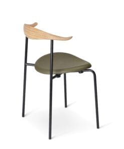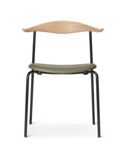 Den elegante kombination af polstring, træ og stål viser Hans J. Wegners evne til at få minimalistiske former til at fremstå bløde og behagelige.